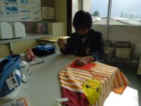 6年生(家庭科):エプロンの製作も最終段階。ポケットの位置を考えて、縫い付けると完成です。