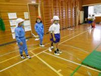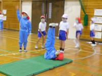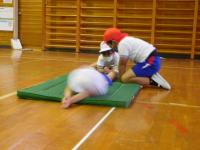 1・2年生(体育):お互いにアドバイスをしながらマット運動をしています。