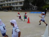 1・2年生(体育):リレーのバトンパスを練習し、リレーの楽しさを味わいました。