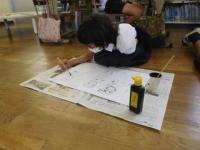 4年生(図工):楽器を演奏する友達を、はしペン絵の具で下書きしました。