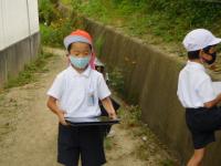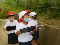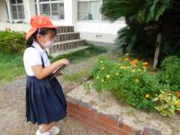 2021年9月28日 11時00分タブレットを使って校庭の花を撮影する1年生。(上手く撮れたかな?)
