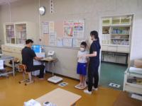 感染症対策をしながら身体計測をする3年生。