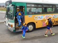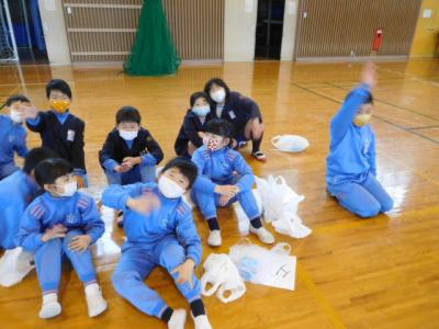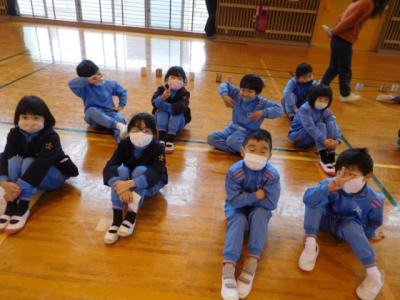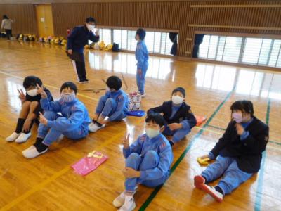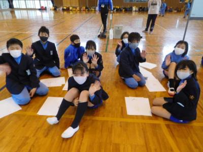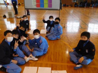 欠席0=77日目の今日は、遠足を兼ねて丹原総合運動公園・体育館へ。開始前から6年生入場の一コマ。