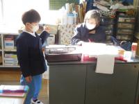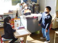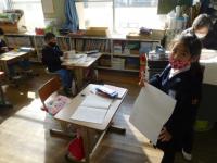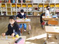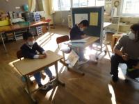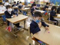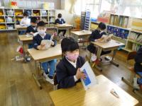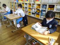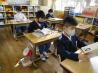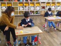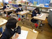 算数のチャレンジプリントや写真立て制作をする1年生。2年生は、算数のテストとその後の読書など。