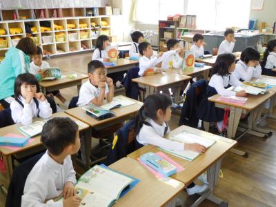 2018年4月25日 11時37分1年生、国語の勉強中。2年生、歯科検診へ待機中。3年生、歯科検診後に各自が読書で待機。