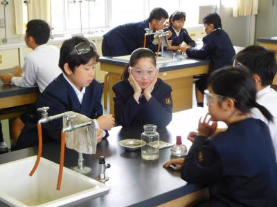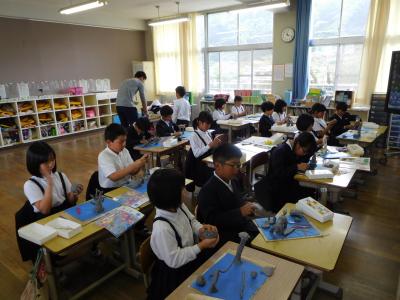 4年生、粘土で思い思いの表現。5年生は、外国語の学習中。6年生は、実験の確認と準備へ。